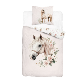 Raštas, vaizduojantis arklio galvą, apsuptą gėlių, suteikia visam komplektui lengvumo ir pasakos pojūtį. Kruopščiai pagamintos detalės paverčia šią patalynę ne tik praktišku baldu, bet ir gražiu vaiko interjero papildymu.