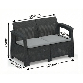 Sofos matmenys: 121 x 65 x 75 cm.