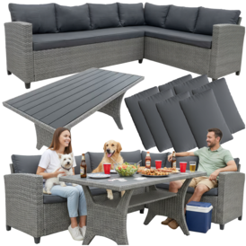 Sodo baldų komplektas, technoratano kampinė sofa + stalas + pagalvės